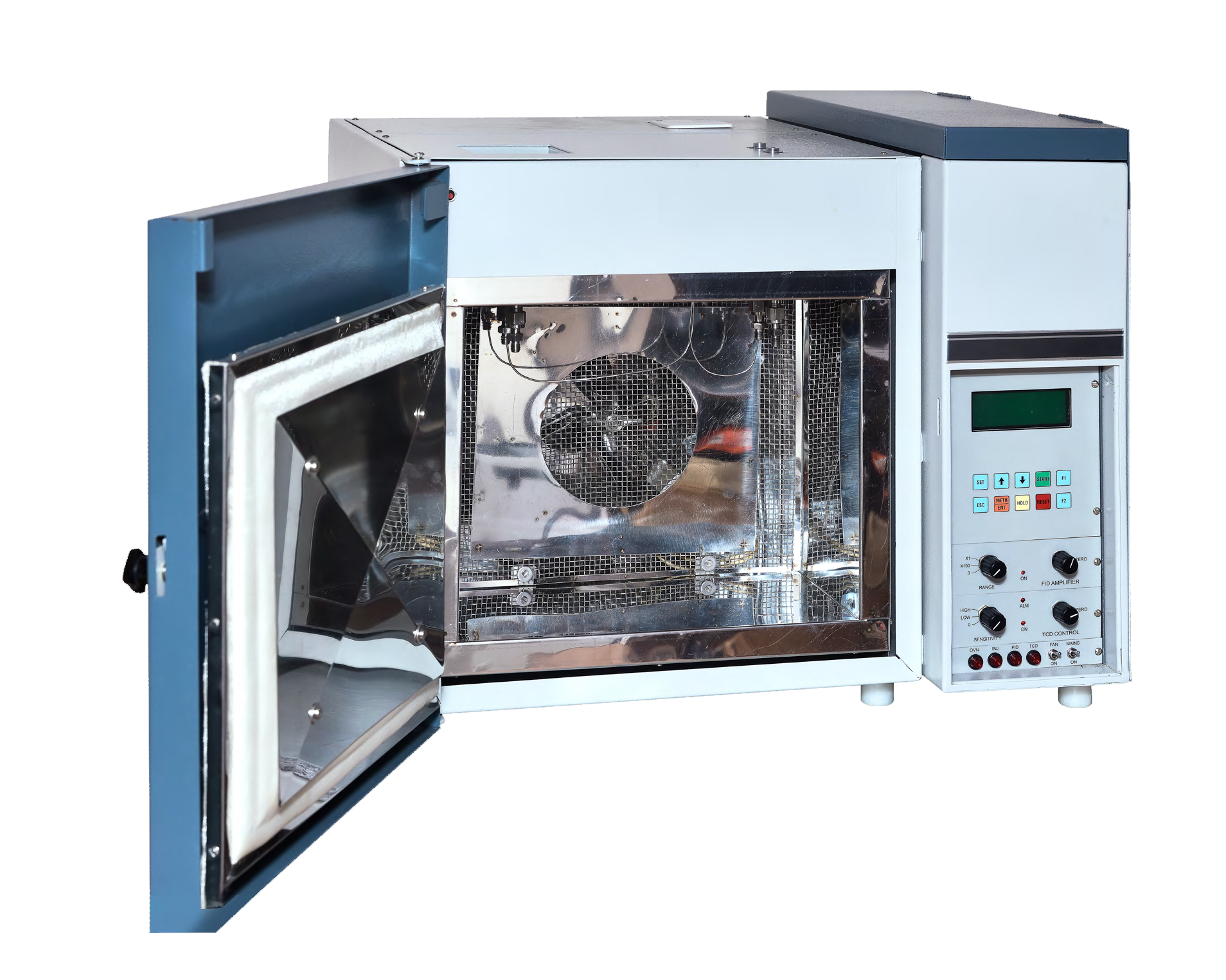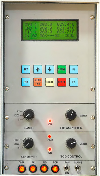 All the parameters, (set and actual), are displayed. The higher temperature cut off (adjustable) are provided for all the channels. Flame Ionisation Detector is designed to give high sensitivity, while Thermal Conductivity Detector is with minimum cell volume to get maximum sensitivity.